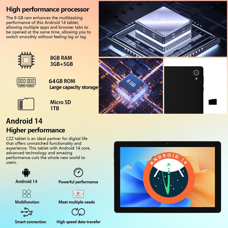 - 【Android 14 Tablet】10.1 inch tablet, Android 14 octa core, the latest operating system, improves privacy and security with personalization features for smoother, faster operations.