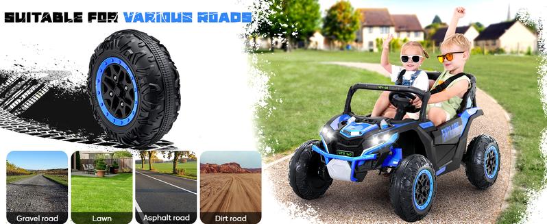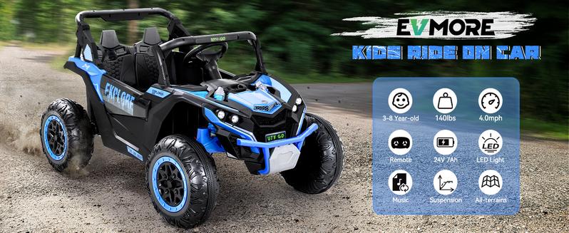 • Powerful Performance: The Evmore ride on toys for kids is equipped with a 24V 7Ah battery and four powerful 40W motors, ensuring long playing time of up to 120 minutes on a full charge; Its dual rear shock absorbers provide excellent climbing stability, making it easy to navigate various terrains such as small slopes, gravel road, grass, asphalt road, dirt road and so on