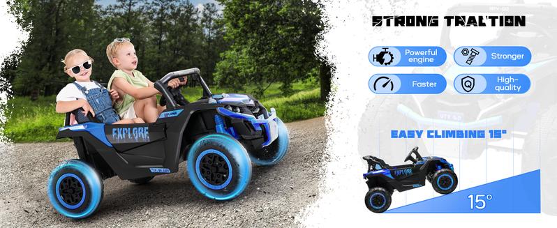 • Cool Lighting & Music Fun: The Evmore 24V ride on UTV truck features eye-catching front lights with multiple light beads, enhancing its stylish look while ensuring safety during night rides; In addition to built-in music, parents can connect their phones to play kids' favorite tunes or stories, making every adventure start with the perfect soundtrack